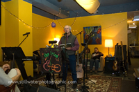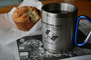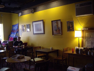 Stroll on in, take a left and the short ramp will land you in the Underdog, where the furniture’s a charming hodge-podge of Goodwill fare. Join me at one of the scarred, scrawled wooden tables. I love the low-slung vinyl chair, the beaded lampshade, the butt-eating couch, the paint-peeling concrete floor and the ubiquitous art on the walls of the Underdog. Drop in at 3:00 p.m. on a Thursday (as I am now) and you might find silence, quite a contrast to Friday nights or weekend mornings. On the other hand, you might overhear an interview in progress; a low, intimate conversation; or someone soapboxing big-time. One afternoon in recent memory I witnessed a meeting of a youth chess club; on another, three elementary-aged girls were singing while bent over their arts, crafts or—who knows—Marxist manifestos. I love the diversity, especially in age.
